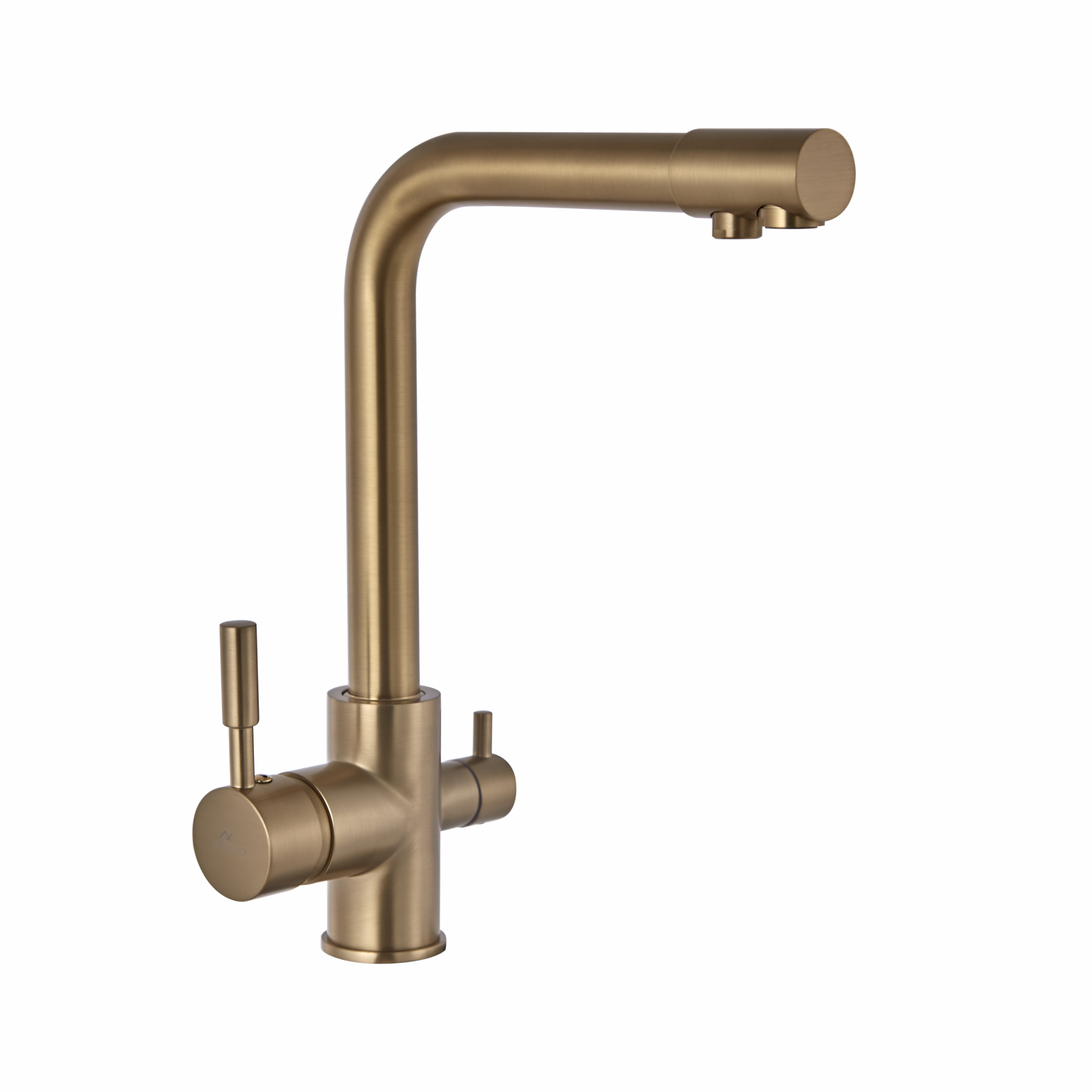 A4352-21 смеситель для кухни для использования с фильтром питьевой воды, H=325 мм бронза, PVD покрытие латунь картридж D=35 мм излив с 2 аэраторами, H=290 мм гибкая подводка: 450 мм в комплекте переходник для соединения с фильтром + крепёж: гайка