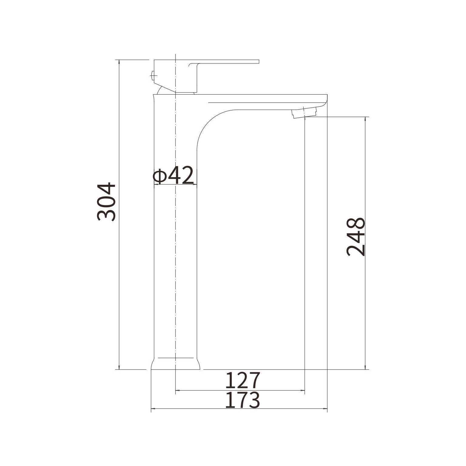 A51219 Смеситель для умывальника высокий, H=304 мм сатин сталь SUS304 картридж D=35 мм излив H=248 мм гибкая подводка с ограничением давления воды: 450 мм в комплекте крепёж: гайка