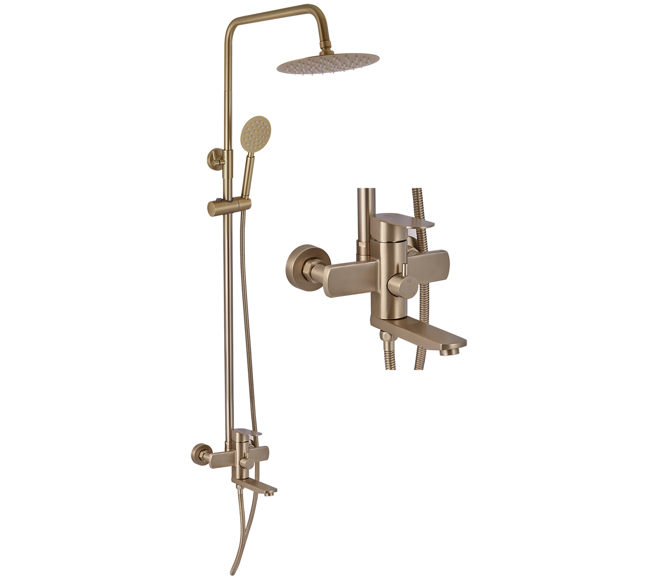 A52401-21 душевая стойка бронза, PVD покрытие смеситель: сталь SUS304, картридж D=35 мм излив: L=102 мм, поворотный дивертор: 3-х ходовой с керамическими пластинами установочный комплект + штанга: сталь SUS201, H=750-1135 мм, бронза верхняя лейка: сталь SUS201, D=200 мм, антикальк, бронза ручная лейка: сталь SUS201, D=96 мм, антикальк, бронза шланг: золотистый, L=1500 мм, PVC